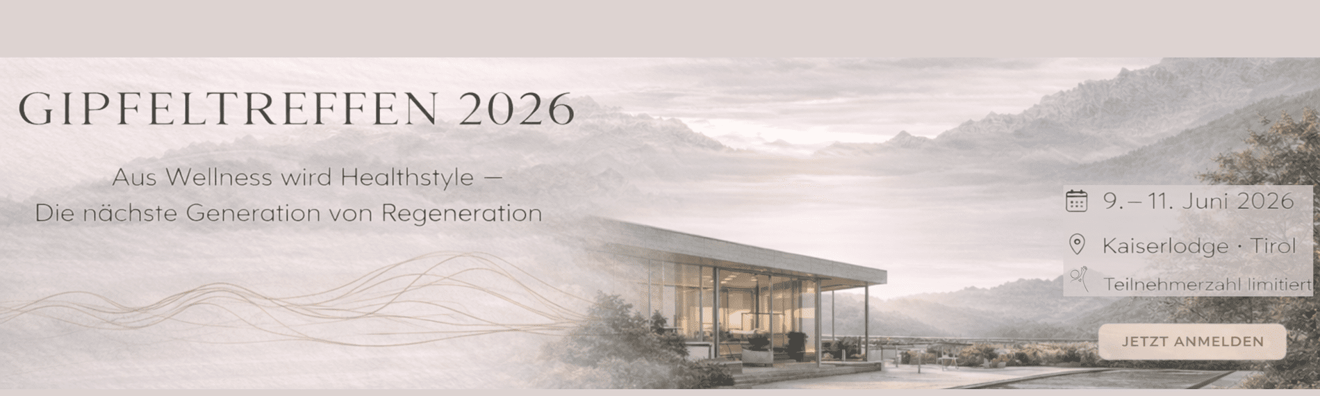 Gipfeltreffen 2026 I jetzt anmelden! GIPFELTREFFEN 2026 Aus Wellness wird Healthstyle. Eine neue Generation von Regeneration entsteht – fundiert, strategisch und erlebbar. Das Gipfeltreffen 2026 ist kein klassisches Event, sondern ein kuratierter Raum für Zukunftsdenken in Health, Hospitality und Führung. Warum jetzt? Gesundheit ist kein Zusatzangebot mehr.Longevity, Regeneration und Leistungsfähigkeit definieren die Erwartungen einer neuen Gästegeneration. Für Hotels, Spas und touristische Betriebe wird Health@Hospitality zum entscheidenden Erfolgsfaktor – strategisch, wirtschaftlich und kulturell. Mehr als Wellness Das Gipfeltreffen denkt Gesundheit nicht als Produkt, sondern als System.Es verbindet Architektur, Kulinarik, Regeneration, Führung und Wissenschaft zu einem ganzheitlichen Healthstyle-Konzept – jenseits klassischer Wellnesslogik. Experience Hub Wissen allein verändert nichts. Erfahrung schon. Der Experience Hub schafft Räume für Selbsterfahrung, Biohacking, Breathwork, Kaltbaden und Austausch. Gesundheit wird hier nicht konsumiert, sondern erlebt, reflektiert und nachhaltig integriert. Inhalte & Themenfelder Die zentralen ThemenHealth@Hospitality als strategische PositionierungRegeneration, Longevity & Zellenergie im HotelkontextSchlaf, Stressregulation, Bewegung & ErnährungMikrobiom, Mikronährstoffe & PerformanceZukunftsfähige F&B-Konzepte mit Gesundheitswirkung Kuratiertes Expertenwissen Das Gipfeltreffen vereint medizinische, wissenschaftliche und praxisnahe Expertise. Impulse kommen von führenden Fachpersonen sowie spezialisierten Netzwerken aus Recovery, Mikronährstoffmedizin, Hypoxietraining und Atemgasanalyse.Unsere Experten Dr. Andrea Gartenbach Prof. Stefan Nungesser Dagmar Rizzatosowie Spezialisten aus wissenschaftlichen Netzwerken:BLACKROLL · Hepart AG · COMMIT · uVIDA · u. v. m. Für wen? Für Hotelinhaber, Direktoren und Führungskräfte, die Gesundheit nicht delegieren, sondern strategisch gestalten wollen. Für Entscheider, die Zukunft aktiv entwickeln – statt Trends zu folgen.Der Rahmen Die Kaiserlodge in Tirol bietet den idealen Kontext: Natur, Architektur, Ruhe und Weitblick. Ein Ort, der Regeneration nicht inszeniert, sondern ermöglicht. 09.–11. Juni 20262,5 intensive Tage inklusive Abendveranstaltung und Community-Erlebnis. Bewusst begrenzte Teilnehmerzahl für Tiefe, Austausch und Wirkung. Seminarpauschale bis 28. Februar 2026: EUR 1.280,- p. P.ab 01. März 2026: EUR 1.480,- p. P. Nächtigung in der Kaiserlodge zu Sonderkonditionen, Selbstzahler.Teilnehmerzahl limitiert Gipfeltreffen 2026 Aus Wellness wird Healthstyle - Die nächste Generation von Regeneration 09. Jun - 11. Jun 2026 Jetzt Anmelden! Early Bird Preis sichern! Gipfeltreffen 2026 Aus Wellness wird Healthstyle - Die nächste Generation von Regeneration 09. Jun - 11. Jun 2026